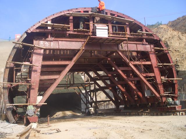 襯砌臺車是隧道施工過程中二次襯砌不可或缺的非標產品,主要有簡易襯砌臺車、全液壓自動行走襯砌臺車和網架式襯砌臺車。全液壓襯砌臺車又可分為邊頂拱式、全圓針梁式、底模針梁式、全圓穿行式等。在水工隧道和橋梁施工中還普遍用到提升滑模、頂升滑模和翻模等。全圓式襯砌臺車常用于水工隧道施工中,不允許隧道有砼施工縱向接縫,在水工隧道跨度較大時一般使用全圓穿行式;邊頂拱式襯砌臺車應用最為普遍,常用于公路、鐵路隧道及地下洞室的砼二次襯砌施工。本文著重介紹山嶺隧道施工中常用砼襯砌臺車的設計與使用。